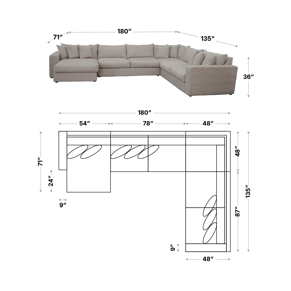| 4pc sectional | 183 in. | 49 in. | 36 in. |