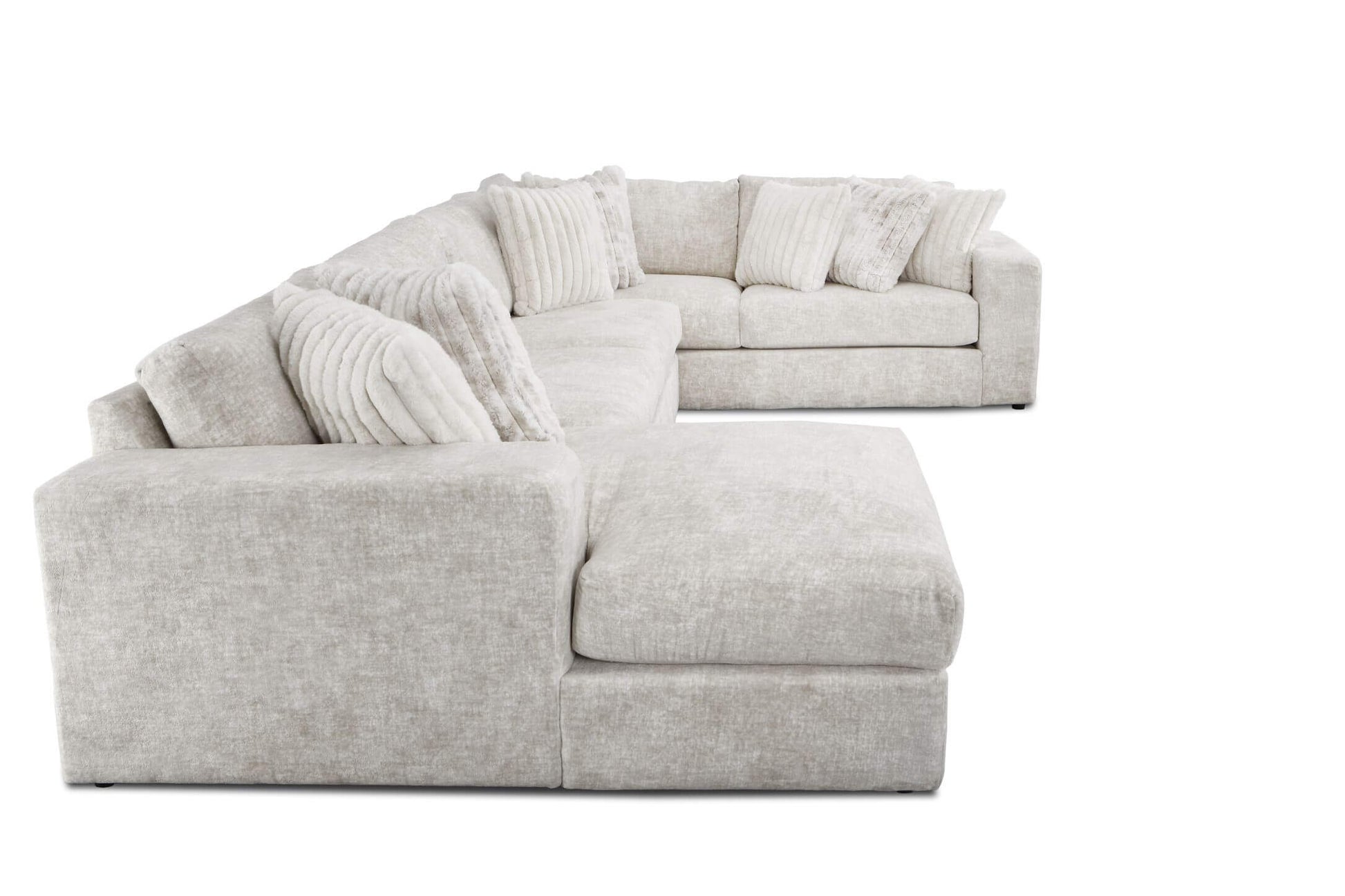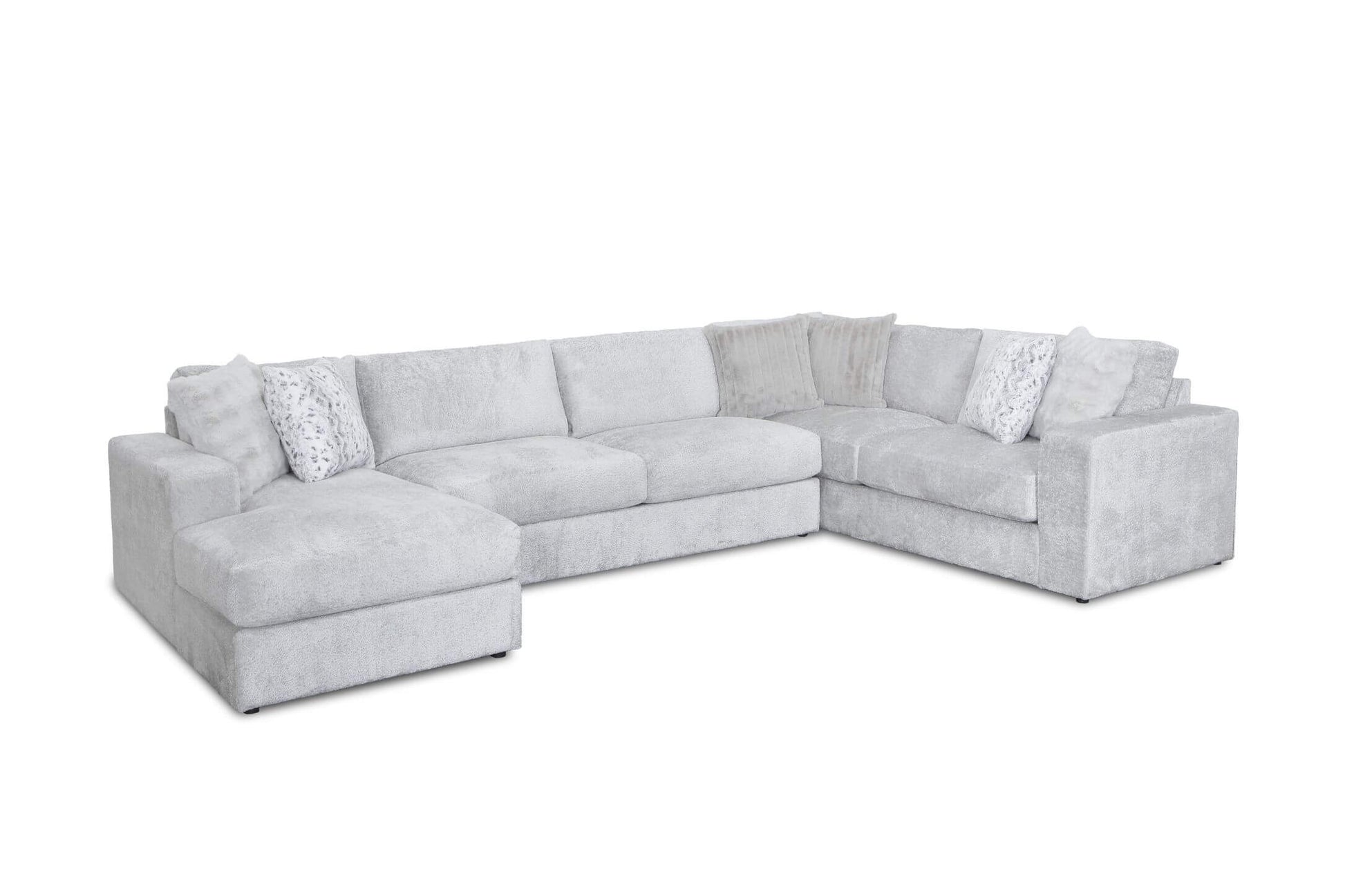 Crafted as the centerpiece for luxurious living, this expansive U-shaped sectional with its matching oversized ottoman is an instant invitation to relax. It is richly upholstered, a serene and elegant neutral fabric that brings warmth and brightness to any room.