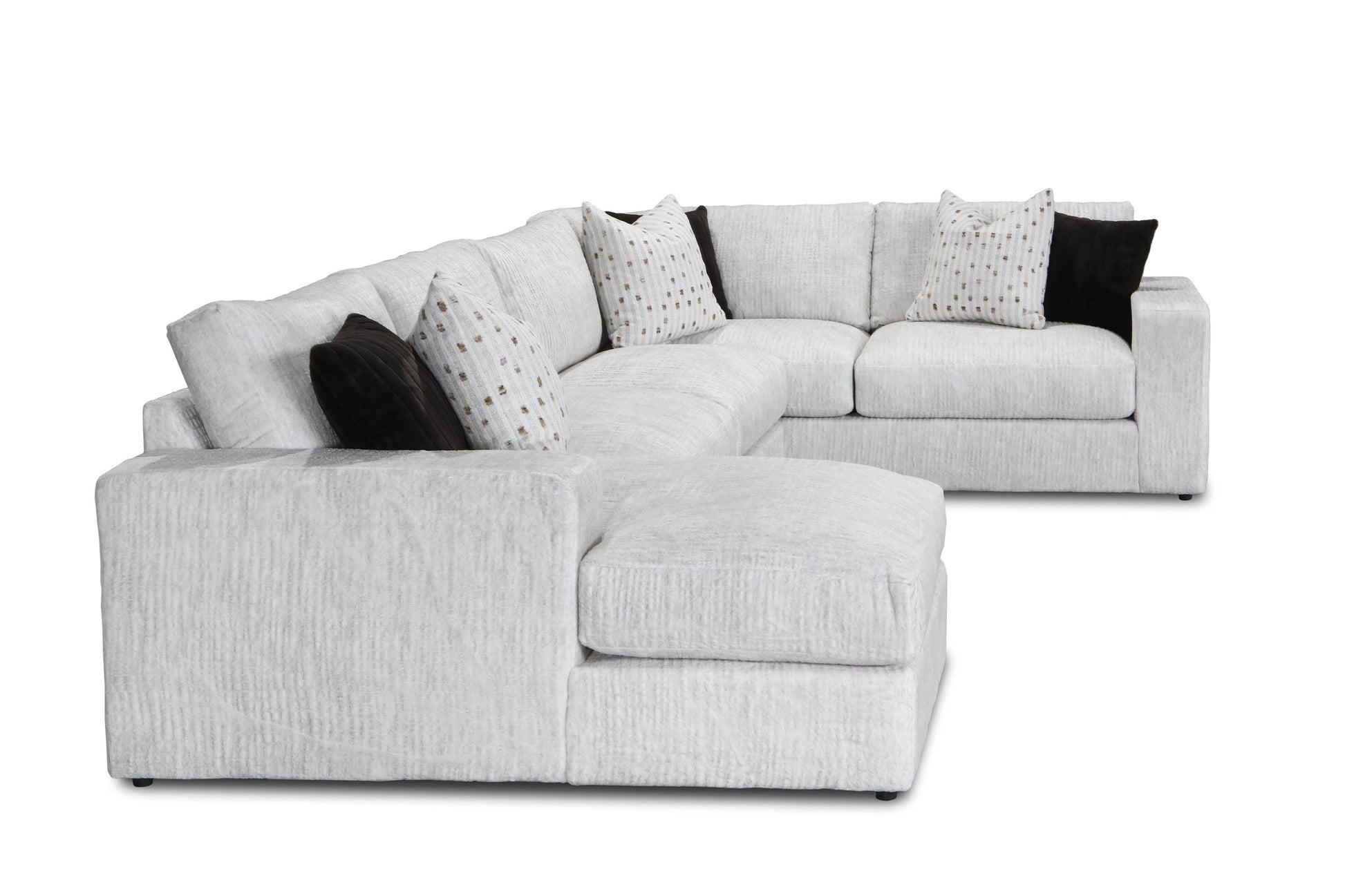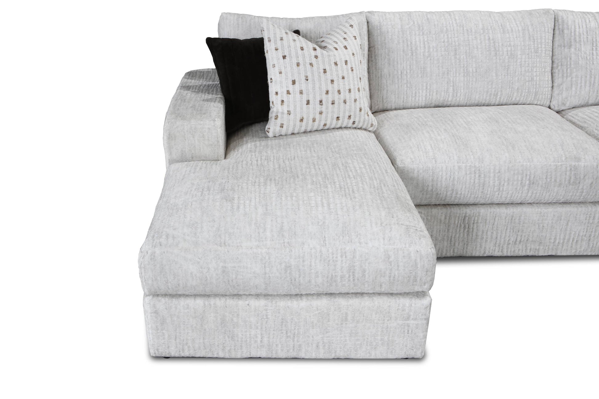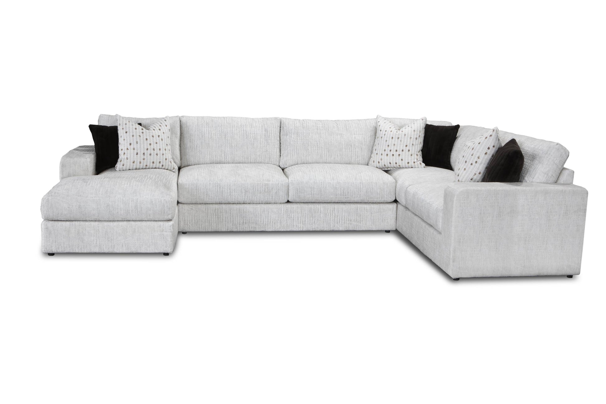 Designed to be the ultimate lounging spot, this generous 3-piece sectional features plush track arm styling and a roomy seat depth, making it the ideal centerpiece for family life and entertaining. The beautiful, bright fabric—a multi-tonal white/light grey—is a performance fabric, ensuring not just stunning looks, but also easy cleanability and low maintenance.