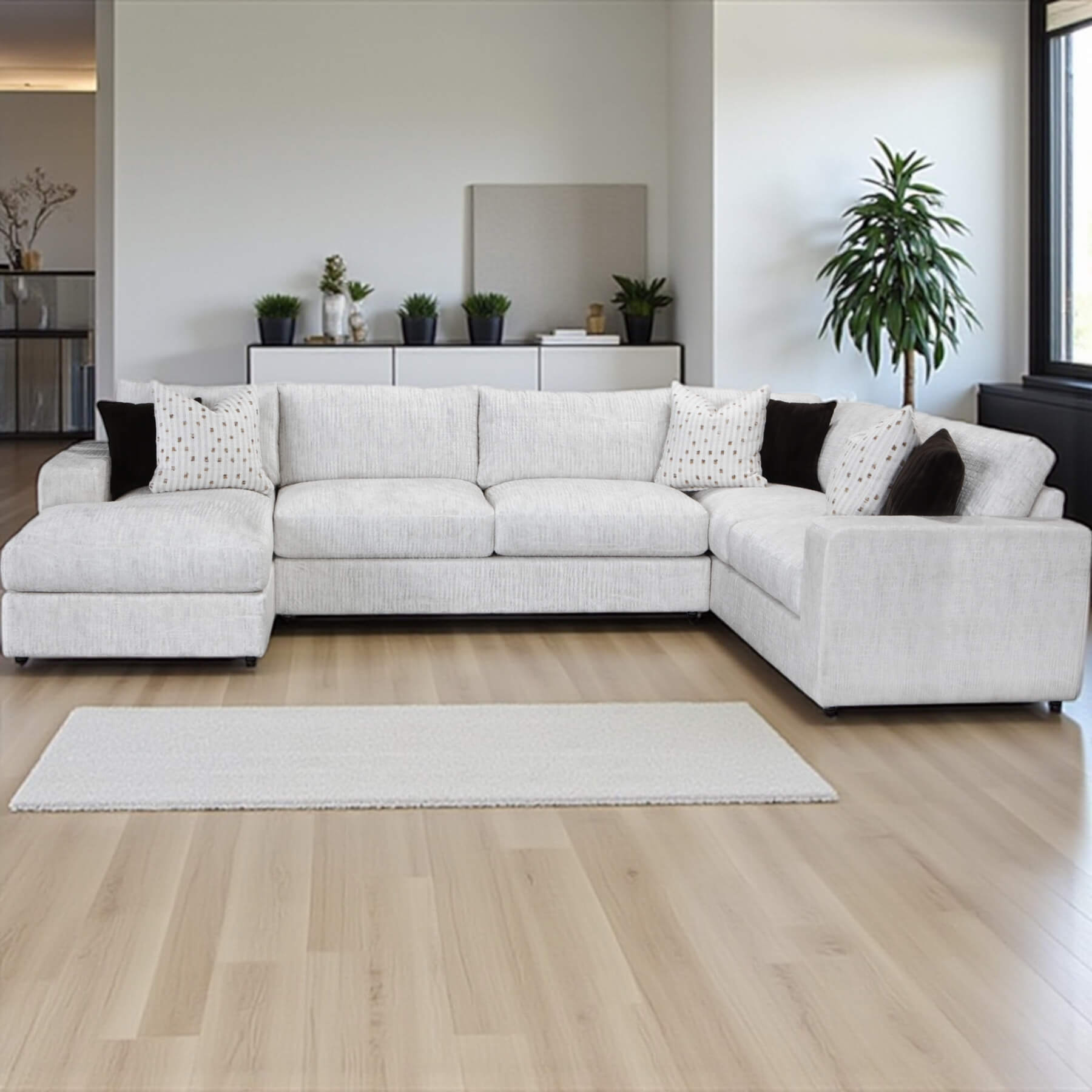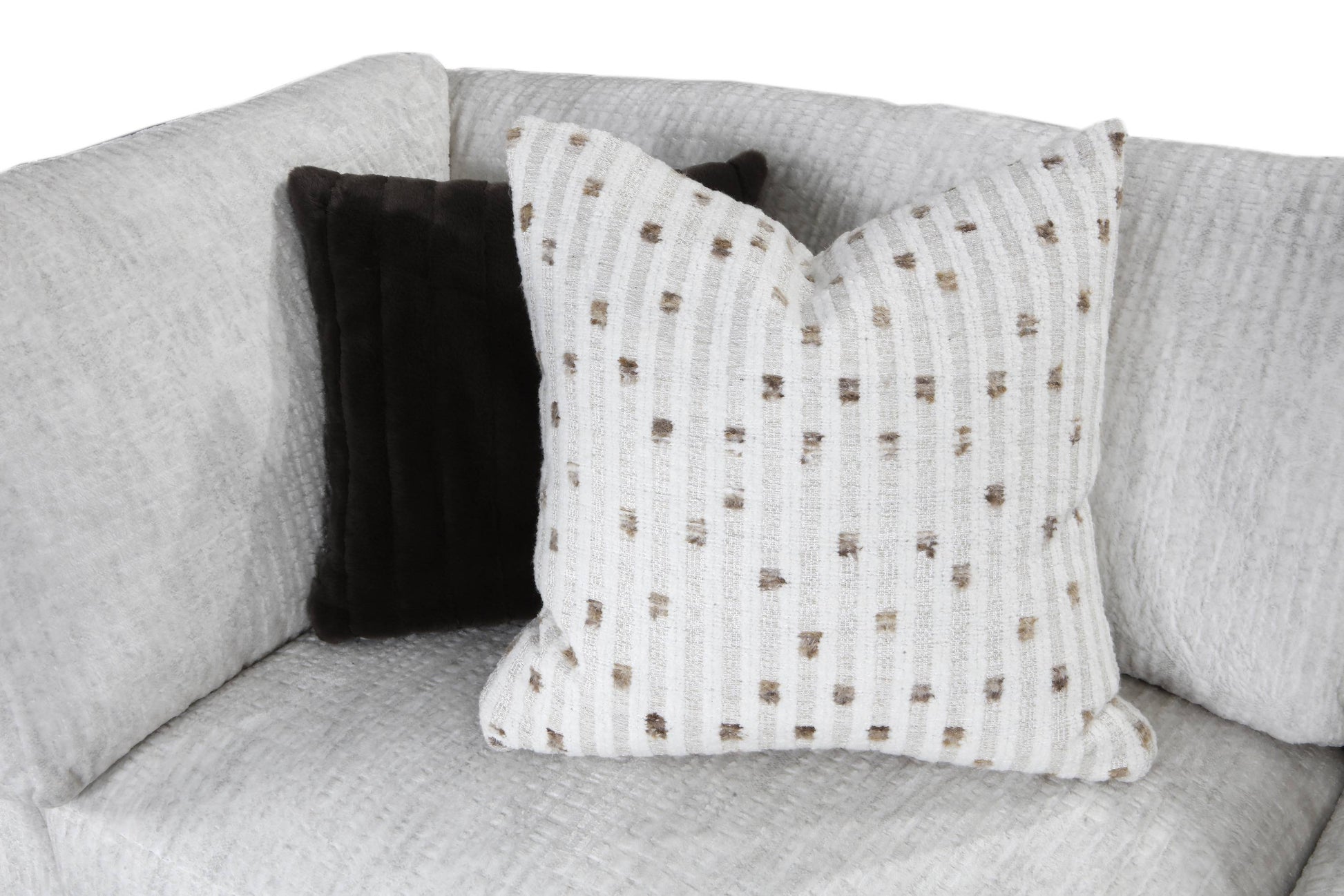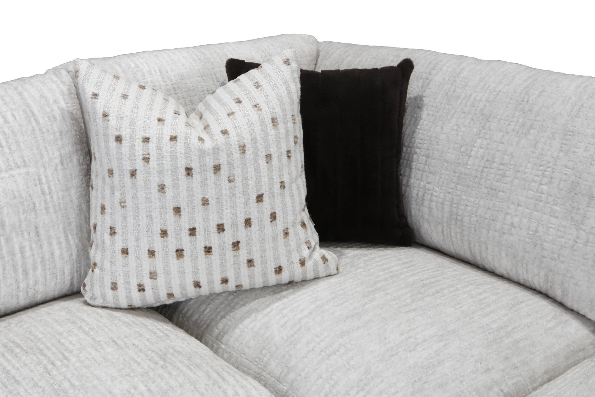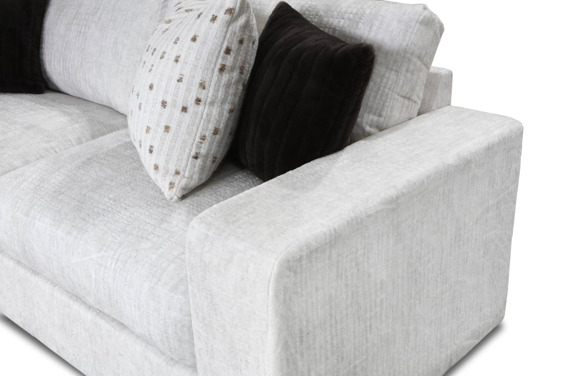 Designed to be the ultimate lounging spot, this generous 3-piece sectional features plush track arm styling and a roomy seat depth, making it the ideal centerpiece for family life and entertaining. The beautiful, bright fabric—a multi-tonal white/light grey—is a performance fabric, ensuring not just stunning looks, but also easy cleanability and low maintenance.