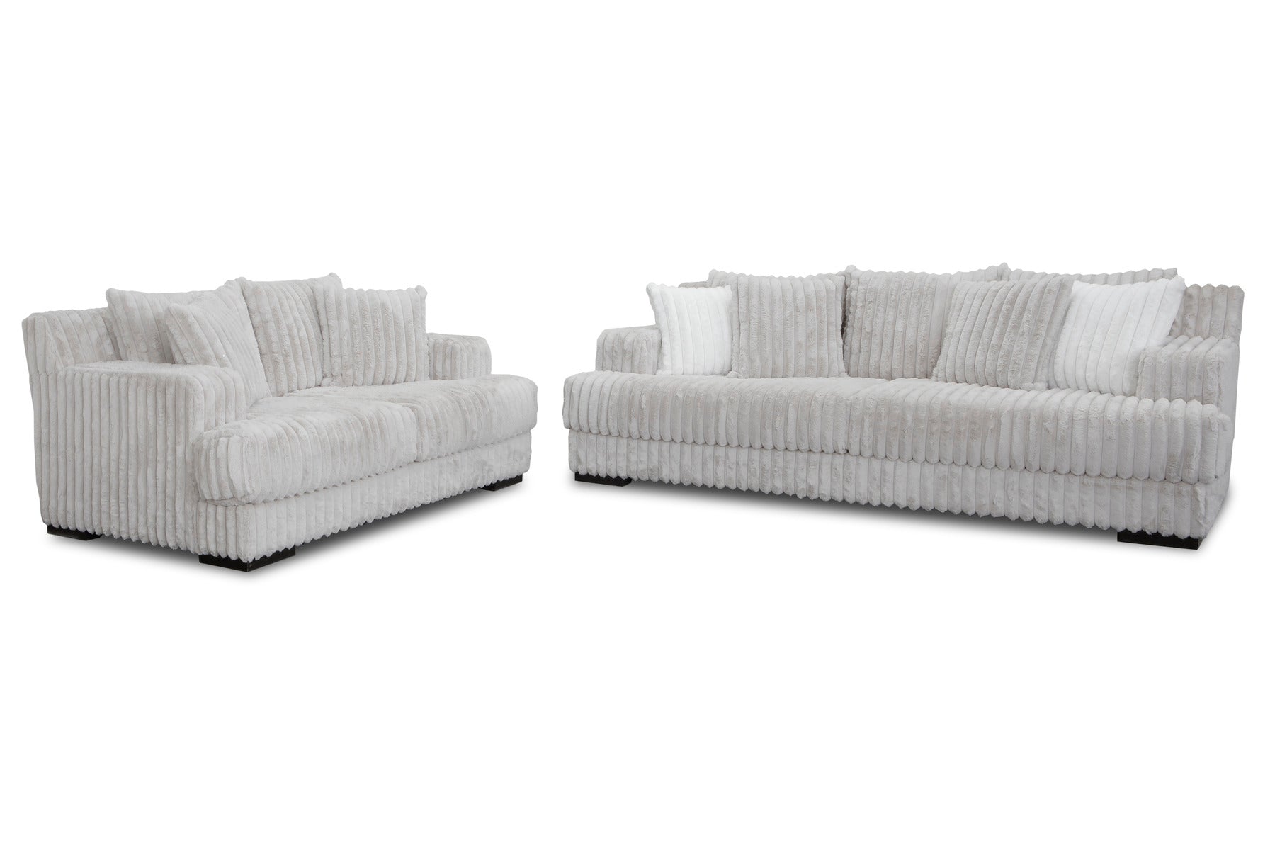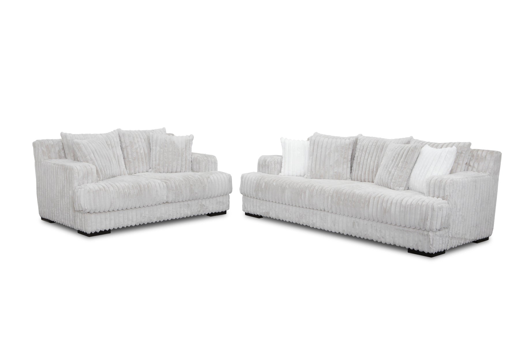 This contemporary seating arrangement is designed to be a soft, yet stunning focal point in your home. The pieces are lavishly upholstered in Mondo Grey fabric, featuring a unique, wide-wale corduroy or channel texture that adds incredible visual interest and a deeply cozy feel. The light grey tone is versatile, brightening your space while maintaining a sophisticated, modern neutral palette.