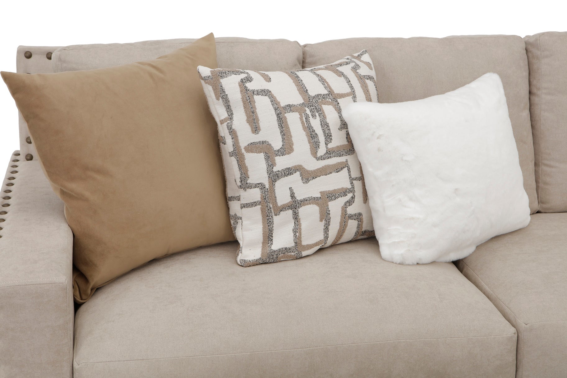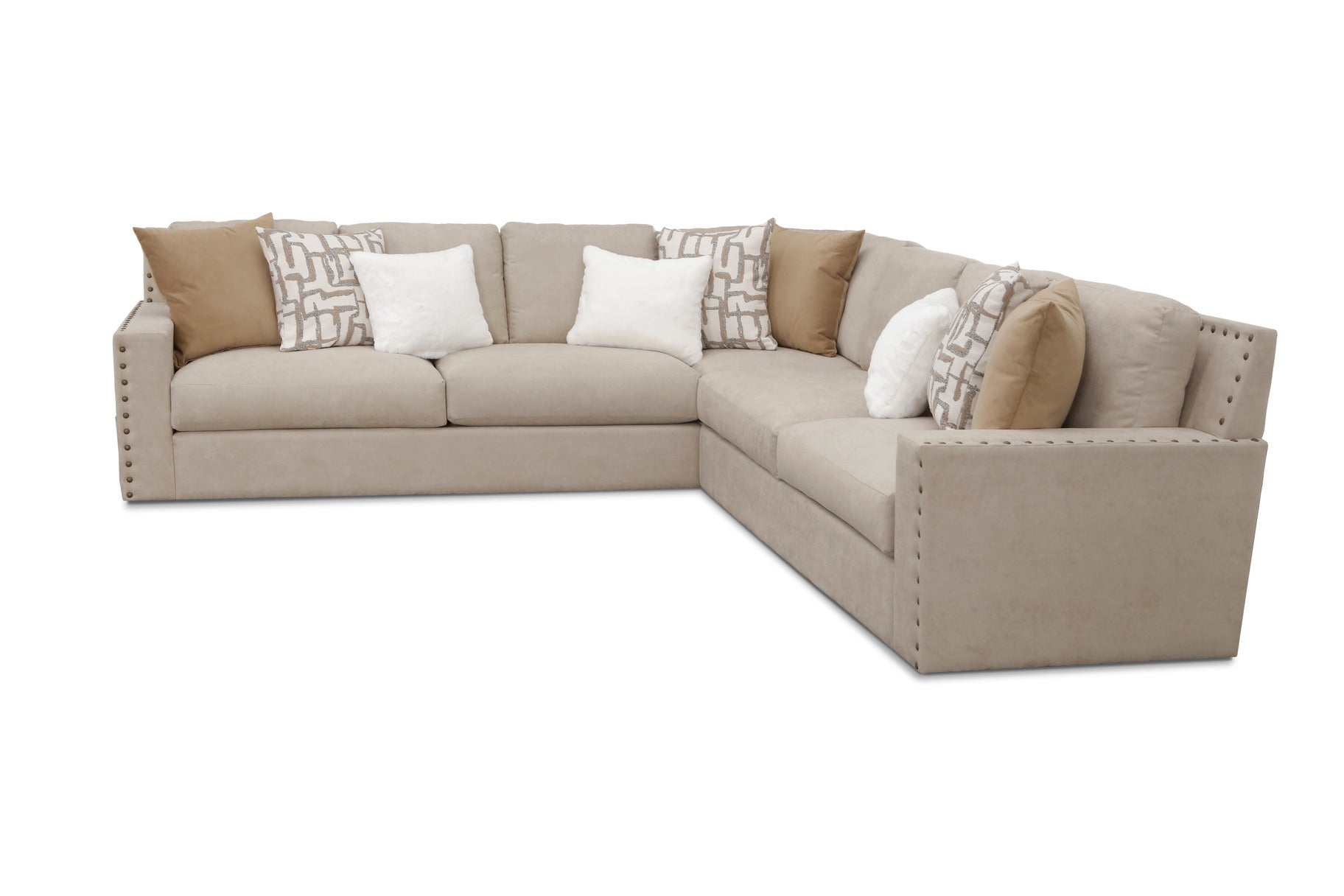 This beautiful L-shaped sofa instantly commands attention with its crisp lines, rolled arm details, and elegant nailhead trim adorning the arms and base—a nod to classic design. Upholstered in the soothing, versatile Sensation Cream fabric, it offers a light, airy foundation that harmonizes perfectly with any decor palette.